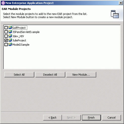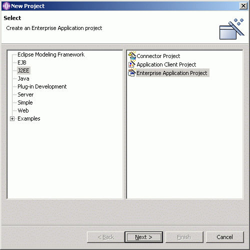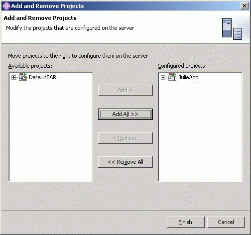 Now, we have to create a test server to run the sample application. Switch to the Server perspective. In the Server Configuration view, create a new "Server and Server Configuration" called JulietServer; it will be a WebSphere version 5.0 Test Environment. Accept the defaults.