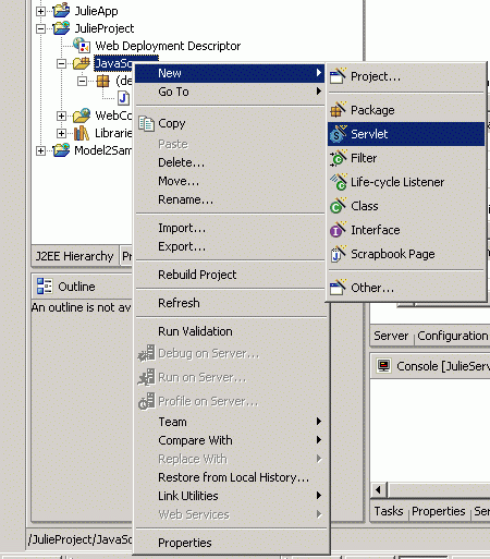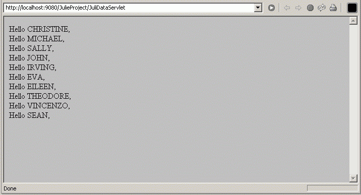 Save the changes. Right click on JulieDataServlet.java, and select "Run on Server." run.gif shows the output displayed in the Web browser of WebSphere Studio Application Developer. We limited to 10 retured names.