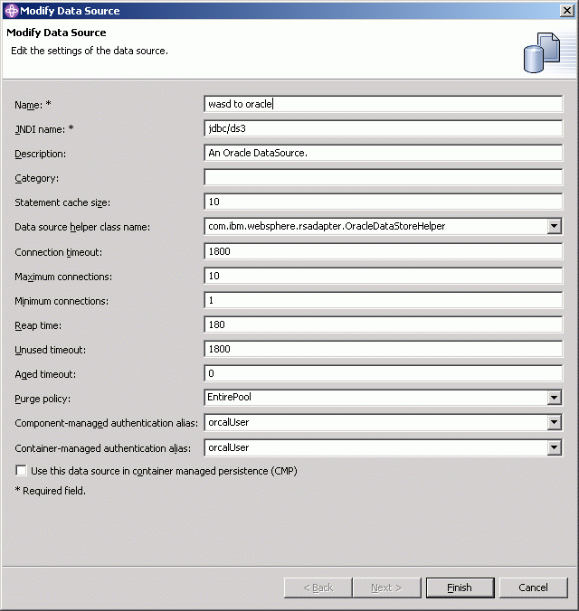 The only required field in the Resources screen is the URL. This field is used by the server to look up the tnsnames.ora file and find the port to the database. Select the URL and make the following modification.The URL format is jdbc:oracle:thin: @xxx.xxx.xxx.xxx:1521:dbalias. This URL is broken into four sections delimited by colons. The URL is defined as follows: